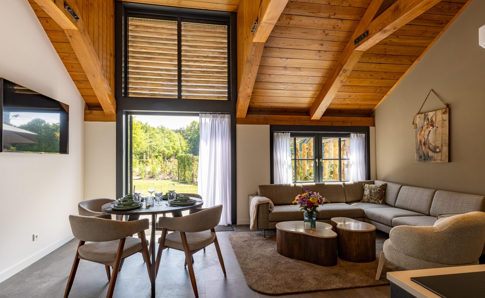 Ervaar het ultieme gevoel van vrijheid in onze Valkse Hoeves, gekenmerkt door hun indrukwekkende glazen puien en natuurlijke materialen. Het open ontwerp zorgt ervoor dat het bosrijke landschap van Landgoed Oud Beekdal altijd dichtbij voelt, terwijl de sfeervolle inrichting direct een gevoel van thuiskomen creëert. Een unieke plek waar het binnen- en buitenleven naadloos in elkaar overgaan.